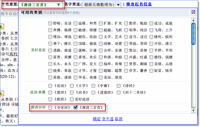 2、美名騰為您準備了上百個起名個性化意愿類別,本例中選擇類別《唐詩三百首》,如下圖所示