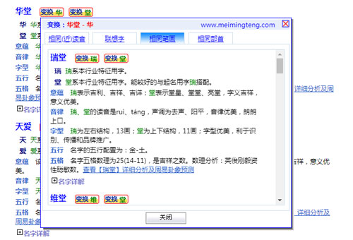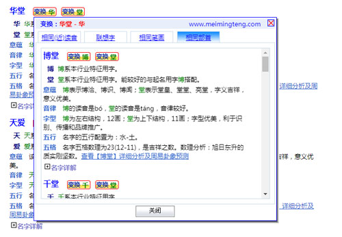 對(duì)起好的名字,還可以根據(jù)讀音,筆畫,字義進(jìn)行無極變換,可以擴(kuò)展出更多的名字供參考。比如,針對(duì)名字“華堂”,可以有如下無極變化: