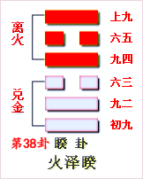 這個卦是異卦(下兌上離)相疊。離為火;兌為澤。上火下澤,相違不相濟??藙t生,往復無空。萬物有所不同,必有所異,相互矛盾。睽即矛盾。
